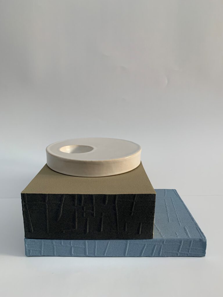 Object met cirkel en rechthoek, Klei. 8,5 x 26 x 21 cm. Object bestaat uit 8 delen.